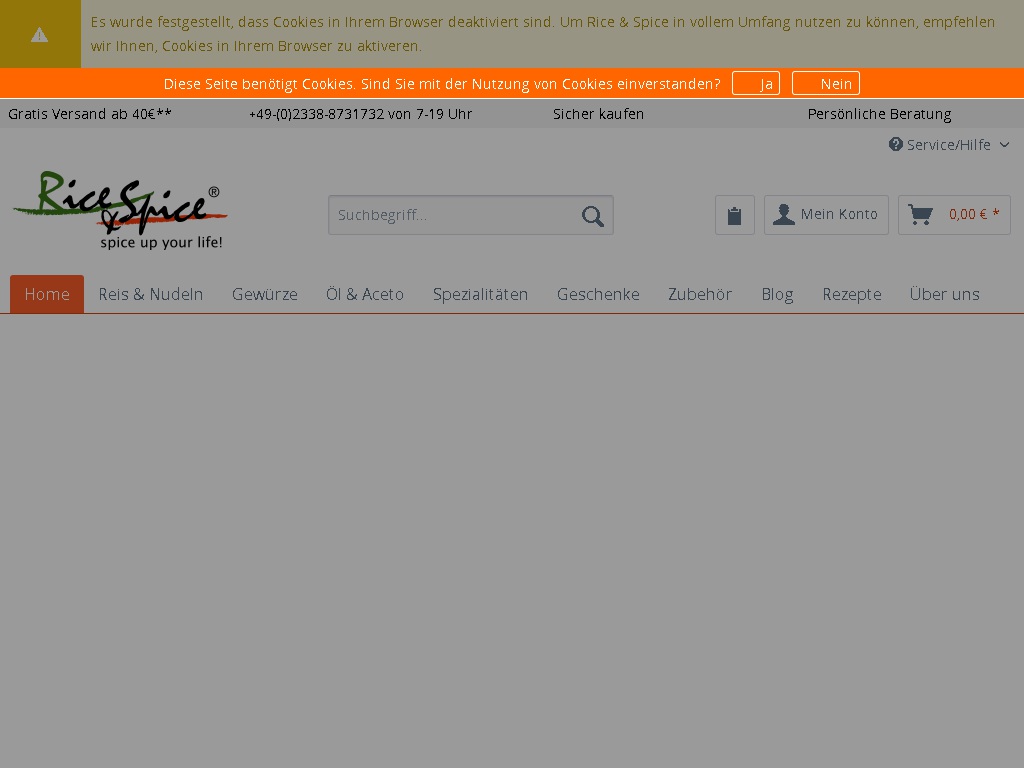 Bei Rice & Spice finden Genießer Reis- und Pasta-Variationen, reine aromatische Gewürze, Kräuter und Gewürzmischungen, fein mildes Olivenöl, prämierte Aceto Balsamico Essige, Delikatessen wie Pekannussöl und original italienische Pinienkerne sowie Küchenhelfer und Küchenaccessoires. Entdecken Sie außerdem neben hocharomatischen Basis-Gewürzen Exoten wie Ingwer, Kurkuma, Garam Masala und Kardamom.