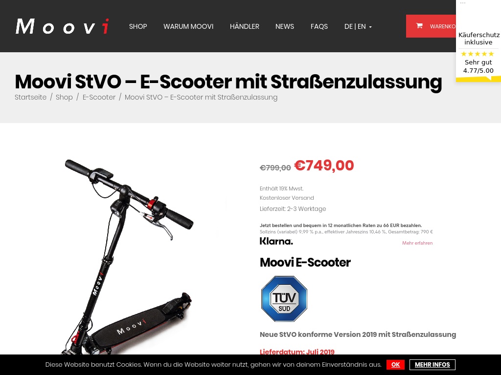 Mit seinem neuen E-Scooter Modell StVO ist Moovi einer der ersten E-Scooter in Deutschland mit Straßenzulassung. Als Liebling der Presse genießt Moovi hohe mediale Aufmerksamkeit und konnte bereits durch Berichterstattungen auf pro7, NDR, Welt, ZDF heute und in Zeitschriften wie Auto Motor Sport, Freundin, Boote und dem Condor Magazin glänzen.Der Scooter wird online über den eigenen Onlineshop vertrieben. Als D2C Brand zeichnet sich der Onlineshop als erste Anlaufstelle für Kunden aus und überzeugt durch hohe Kundenzufriedenheit und perfekten Service.