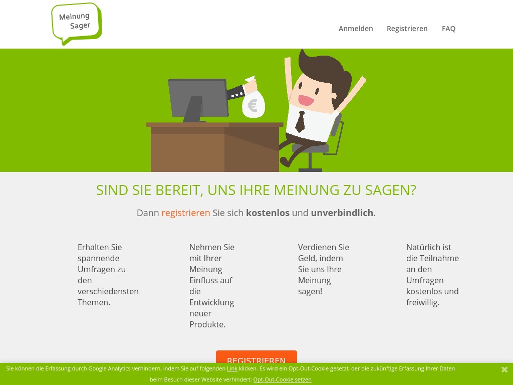 MeinungSager ist ein Konsumenten-Panel (Umfrageportal) von hopp Marktforschung, ein etabliertes und seit 2005 bestehendes Full-Service Marktforschungsinstitut aus Berlin. Nach kostenloser Registrierung erhalten die Teilnehmer Einladungen zu verschiedenen Umfragen, für die sie bei erfolgreicher Teilnahme eine Vergütung erhalten, die per Banküberweisung ausgezahlt werden kann.