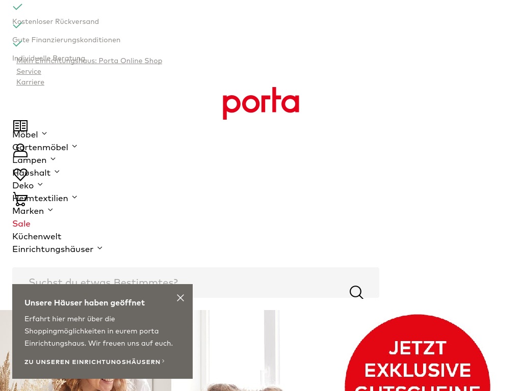 Küchen, Betten, Sofas, Schränke, Kleinmöbel, Heimtextilien, Deko-Artikel und vieles mehr: Bei porta Möbel finden Wohnliebhaber alles, was sie sich für ihre perfekte Zuhausezeit nur wünschen können. Deutschlandweit bietet der Einrichtungsspezialist aus Ostwestfalen seinen Besuchern in 26 Einrichtungshäusern bezaubernde Wohnwelten voll Inspiration und Lebensfreude. Und all das gibt es natürlich auch online zu entdecken! Übersichtliche Produktdarstellungen, eine zielgenaue Suchfunktion und flexible Zahlungsmöglichkeiten machen das virtuelle Möbelshopping zu einem tollen Erlebnis. In unserem breitgefächerten Sortiment finden Sie schöne Möbel und schicke Wohnaccessoires für jeden Raum in nahezu jedem Stil – und das zu ansprechend günstigen Preisen. Bestellen Sie bequem von überall aus und lassen Sie sich Ihren Wohntraum ganz einfach liefern. Oder Sie nutzen unseren Click&Collect-Service und holen Ihre neuen Wunschmöbel direkt im Einrichtungshaus in Ihrer Nähe ab. Viel Vergnügen beim Stöbern und Einrichten!