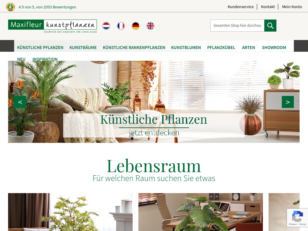 Maxifleur Kunstpflanzen ist Spezialist und internationaler Marktführer für hochwertige Kunstpflanzen, Kunstbäume, Kunstpalmen und künstliche Hängepflanzen. Das Sortiment besteht aus mehr als 10.000 Produkten – hochwertige Kunstpflanzen aus eigener Produktion, mit viel Liebe zum Detail. Man begegnet ihnen an zahlreichen Orten – sei es in Bürogebäuden, Restaurants, Schwimmbädern, Krankenhäusern, Fitnessstudios, auf dem Kreuzfahrtschiff oder einfach nur in den eigenen vier Wänden von Pflanzenliebhabern und -liebhaberinnen.