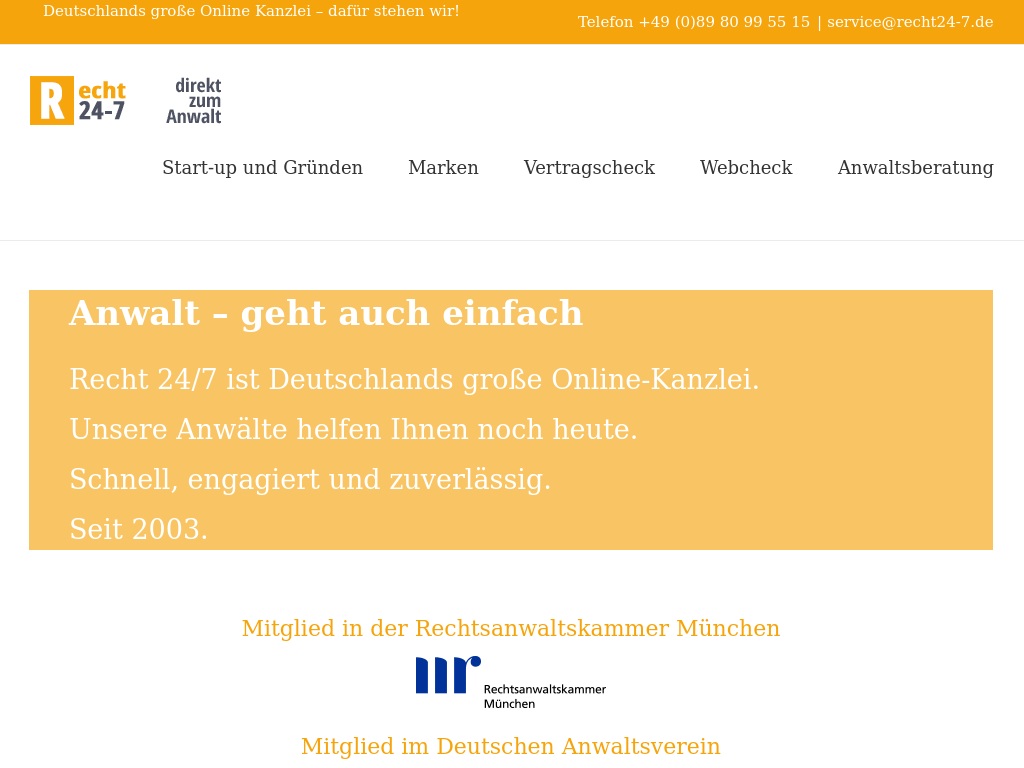 Mit dem Slogan “Anwalt geht auch einfach” wurde die Kanzlei Recht 24/7 im Jahr 2003 ins Leben gerufen. Unser Ziel ist es – allen Menschen einfach, unkompliziert und zu einem fairen Preis Zugang zu einem Anwalt und ihrem Recht zu ermöglichen.