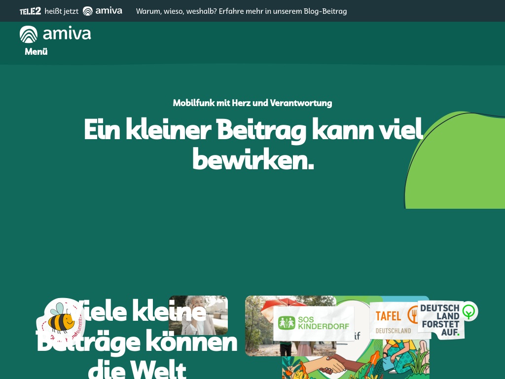 Für jeden neu abgeschlossenen Mobilfunkvertrag überweist Amiva monatlich einen Euro an eine von vier gemeinnützigen Organisationen: Deutschland Forstet Auf gUG, Deutschland summt! (Stiftung für Mensch und Umwelt), Tafel Deutschland e.V. und SOS-Kinderdorf e.V.